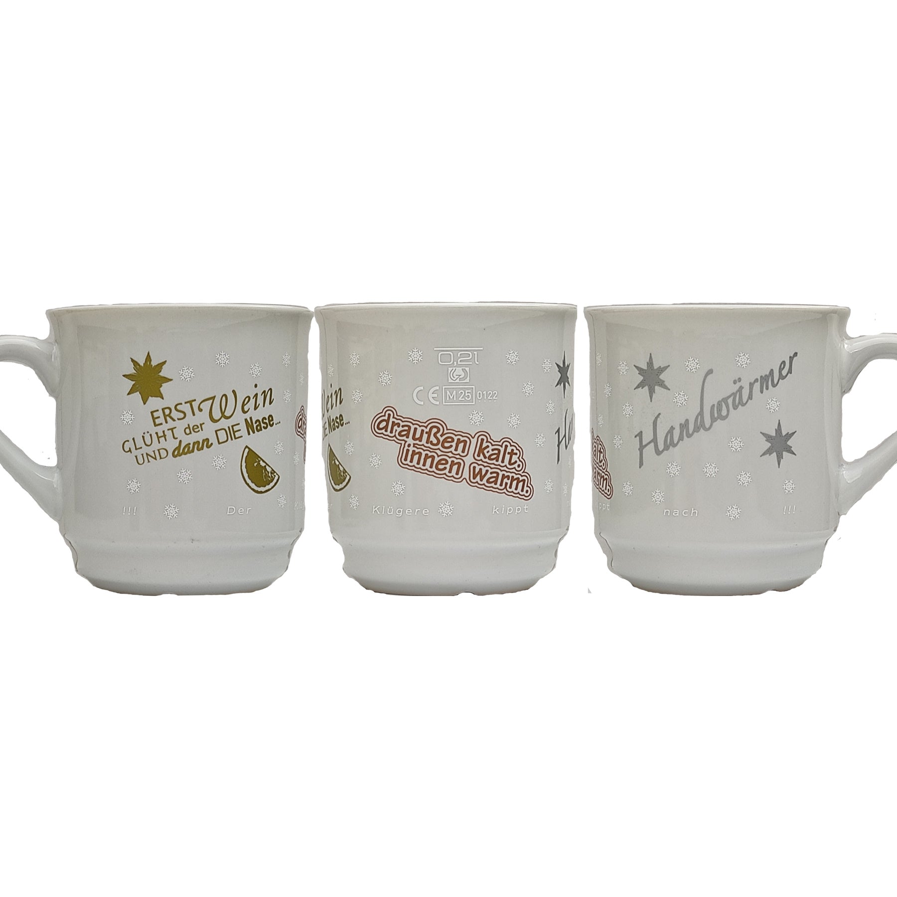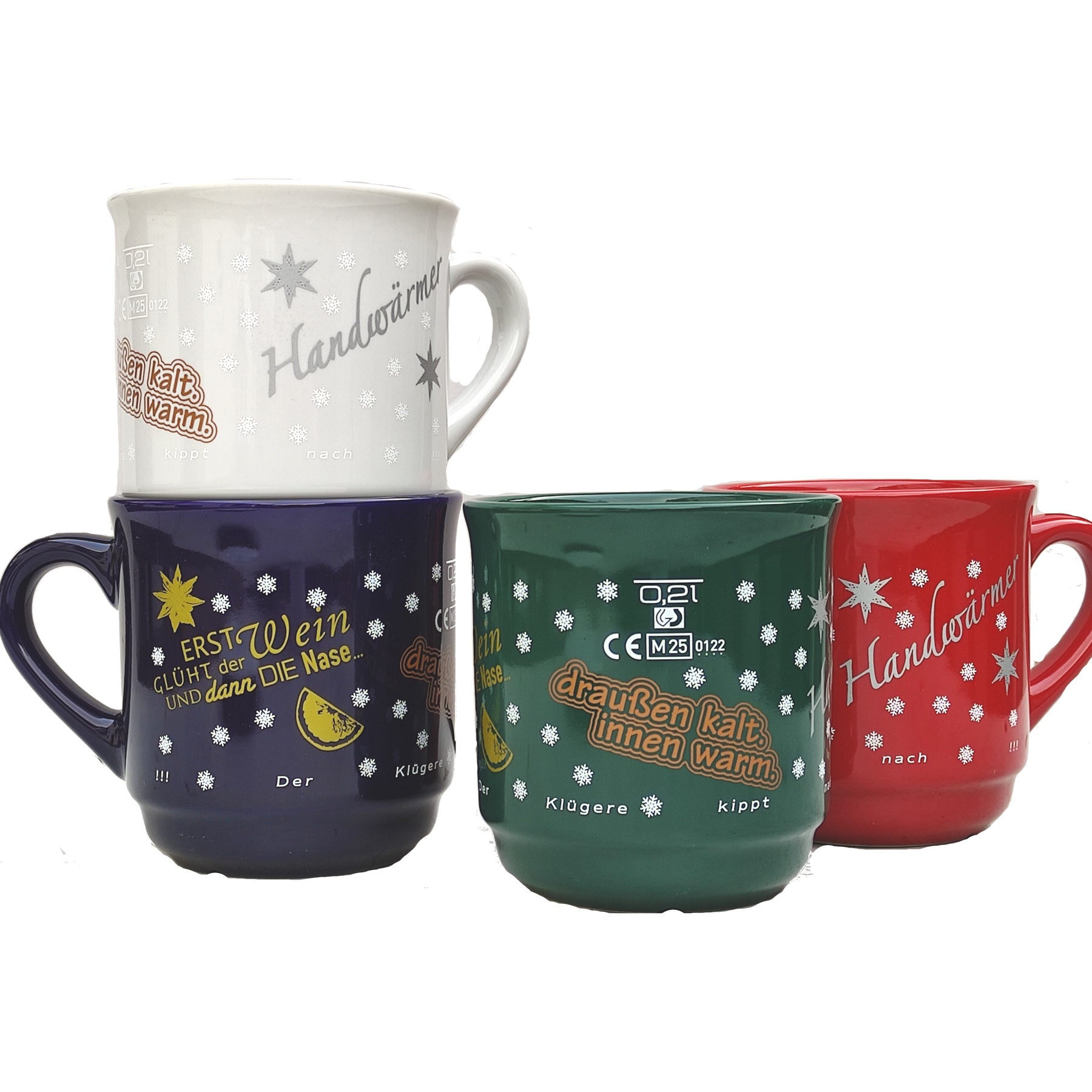 Neu im Sortiment aufgrund der hohen Nachfrage: Glühweintassen aus Keramik, in vier verschiedenen Farben. Hier mit Dekor "Glühweinsprüche" in vierfarbig goldmetallic-silbermetallic-kupfermetallic-weiß.
