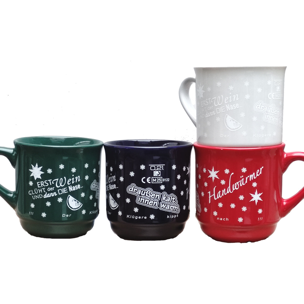 Neu im Sortiment aufgrund der hohen Nachfrage: Glühweintassen aus Keramik, in vier verschiedenen Farben. Hier mit Dekor "Glühweinsprüche" in einfarbig weiß.