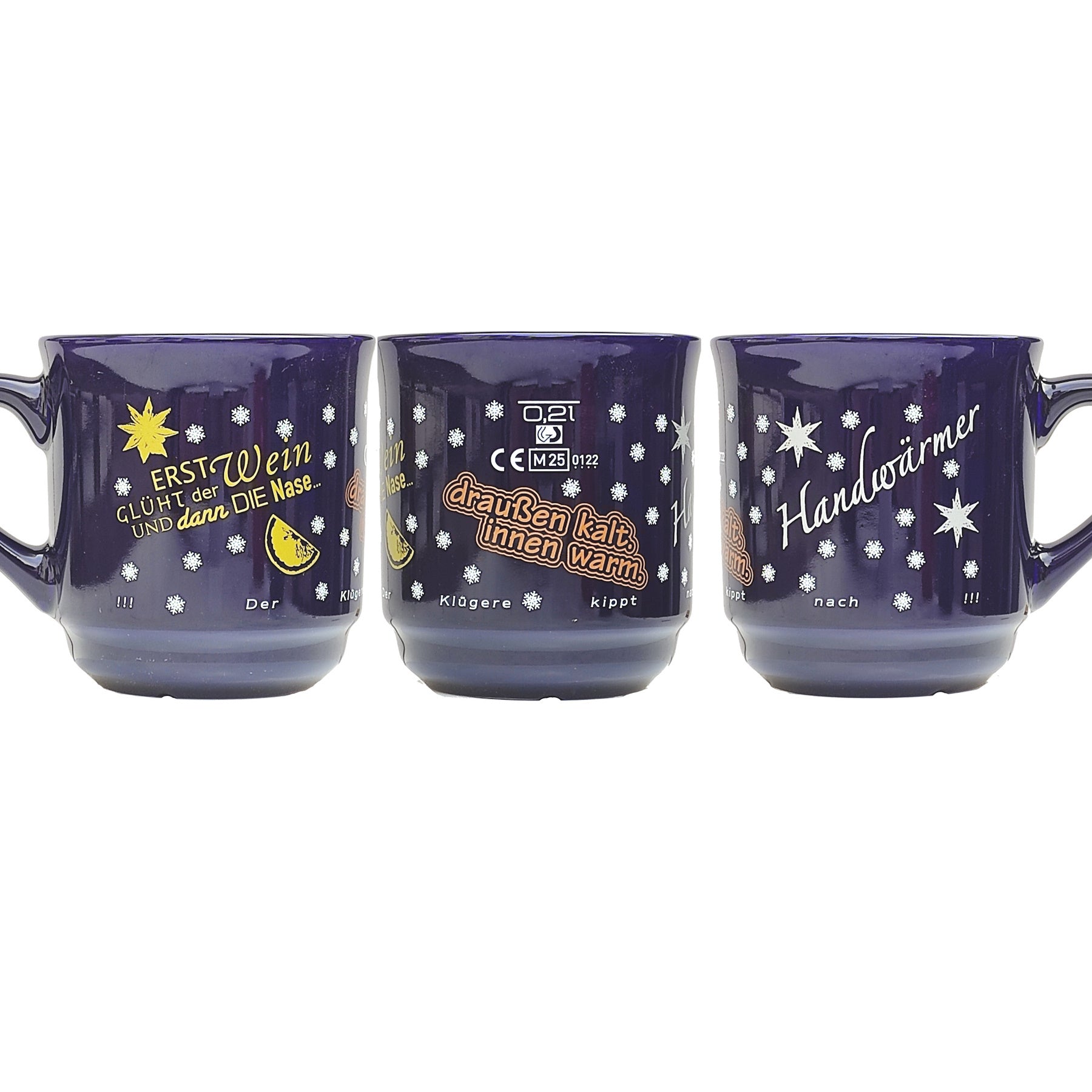 Keramik-Glühweintasse 26 cl, blau, stapelbar, Füllstrich 0,2 l, Dekor "Glühweinsprüche" vierfarbig