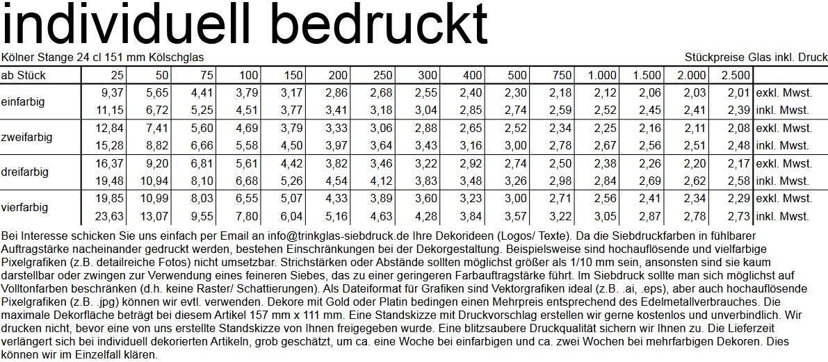 Besonders wichtig ist uns der Hinweis, dass wir die Kölschgläser auch mit einem individuell nach Ihren Vorgaben angefertigten Siebdruckdekor liefern können. Die Lieferzeit erhöht sich dadurch mit etwas Glück nur um ein paar Tage, je nach Auslastung unserer Dekorationsabteilung. Nähere Informationen hierzu finden Sie bei den Abbildungen. Wir freuen uns auf Ihre Anfrage.