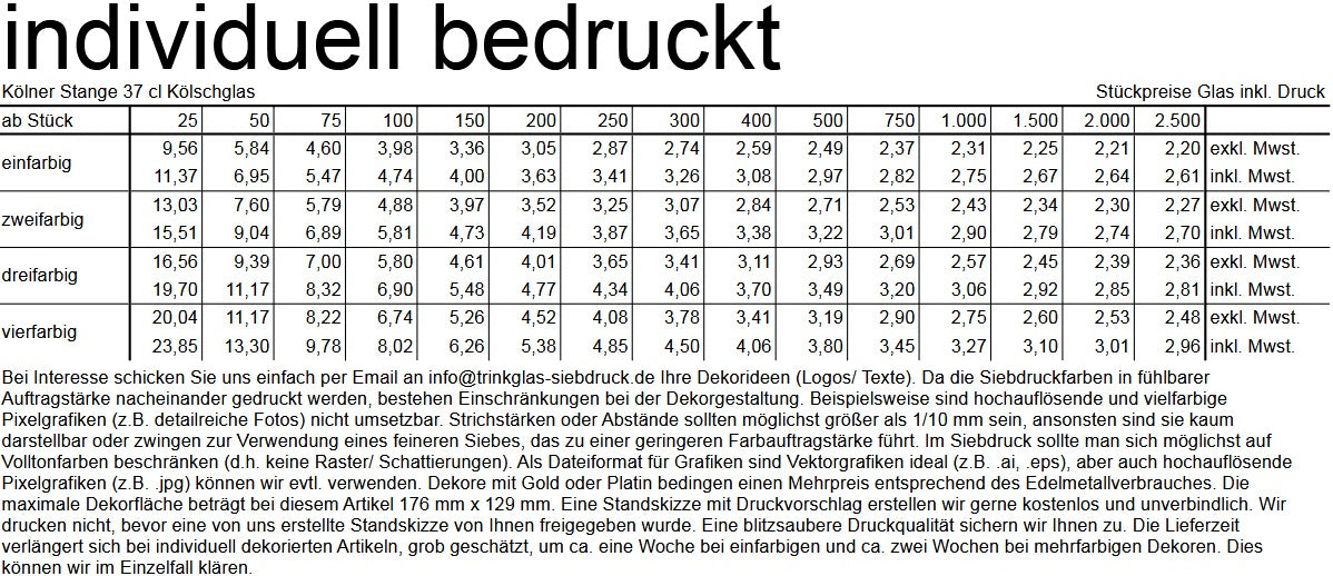 Unsere Kölschgläser sind von hervorragender Qualität. Sie werden häufig mit Siebdruckdekoren dekoriert und müssen daher Veredlerqualität aufweisen. Wir bieten sie in verschiedenen Größen und Formen von 0,1 bis 0,3 Litern an. Von Zeit zu Zeit haben wir auch z.B. mit Dekoren oder Goldrändern veredelte Kölschgläser im Angebot. Sie finden sie in unserem Sortiment sowohl mit CE-Füllstrichen als auch ohne Füllstriche.